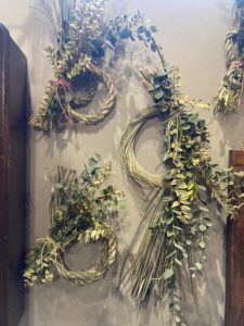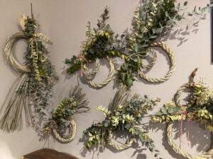 ベースのしめ縄はレモングラス。そこにユーカリと2種類のマートルを飾り付けています。